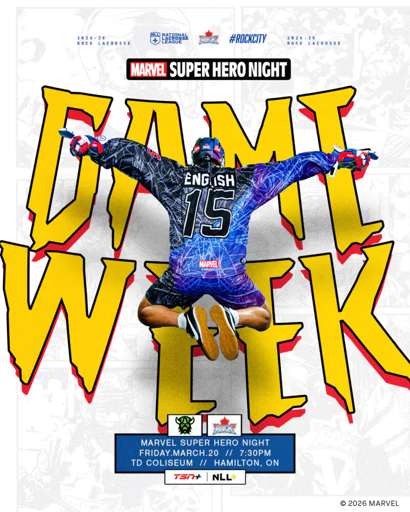 We're web slinging 🕸️ our way into Game Week, Rock City! It's #MARVEL Super Hero Night ...🕷️ this Friday when we host the Saskatchewan Rush at 7:30pm at @TDColiseum in Hamilton! TICKETS: http://bit.ly/2526rocktix #RockCity🎸
