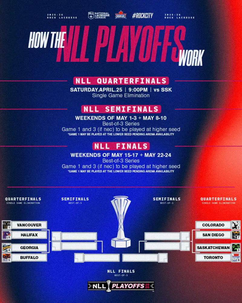 The Rock open the postseason on the road, so we’re bringing the playoff... energy to Radius on Hess this Saturday night for NLL Quarterfinal action.