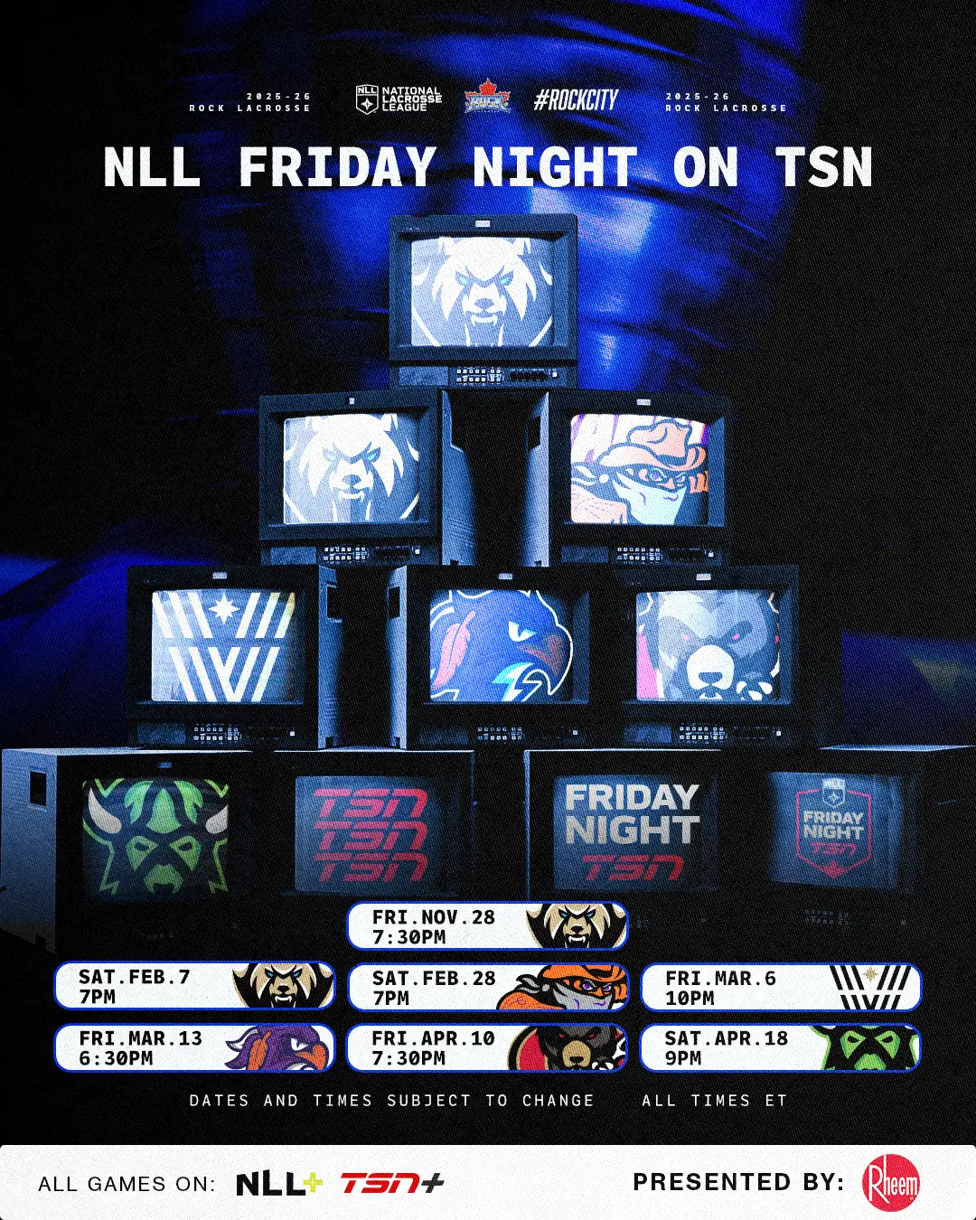 “Our partnership with TSN has elevated the NLL to new levels, making our games more accessible than ever to fans across Canada,” NLL Commissioner Brett Frood said. “This year’s ‘NLL Friday Night on TSN’ schedule, with marquee matchups, doubleheaders and our UnBOXed™ Showcase game, reflects our commitment to delivering the best of box lacrosse to passionate and growing audiences.”